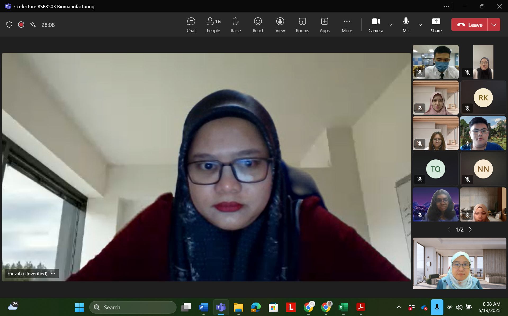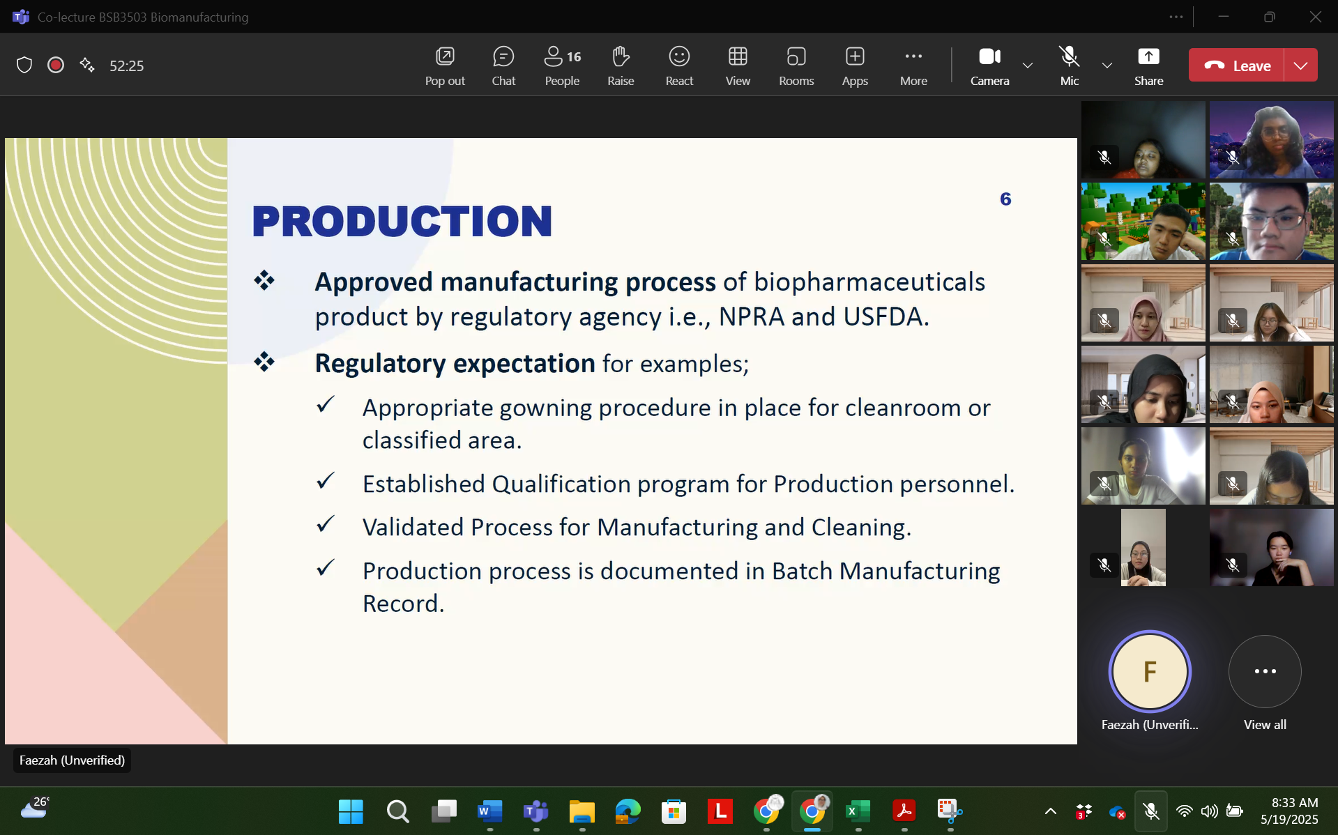19 Mei 2025 – Satu sesi co-lecture bagi kursus BSB3503 Biomanufacturing bertajuk “Overview of Biopharmaceuticals Manufacturing” telah berjaya dilaksanakan dengan penglibatan penceramah jemputan industri, Madam Nor Faezah Esrakh, Associate Manager, QA-QMS dari Biocon Sdn. Bhd., Iskandar Puteri. Beliau mempunyai hampir 20 tahun pengalaman dalam bidang Quality Assurance (QA) dan Quality Control (QC) industri biofarmaseutikal.