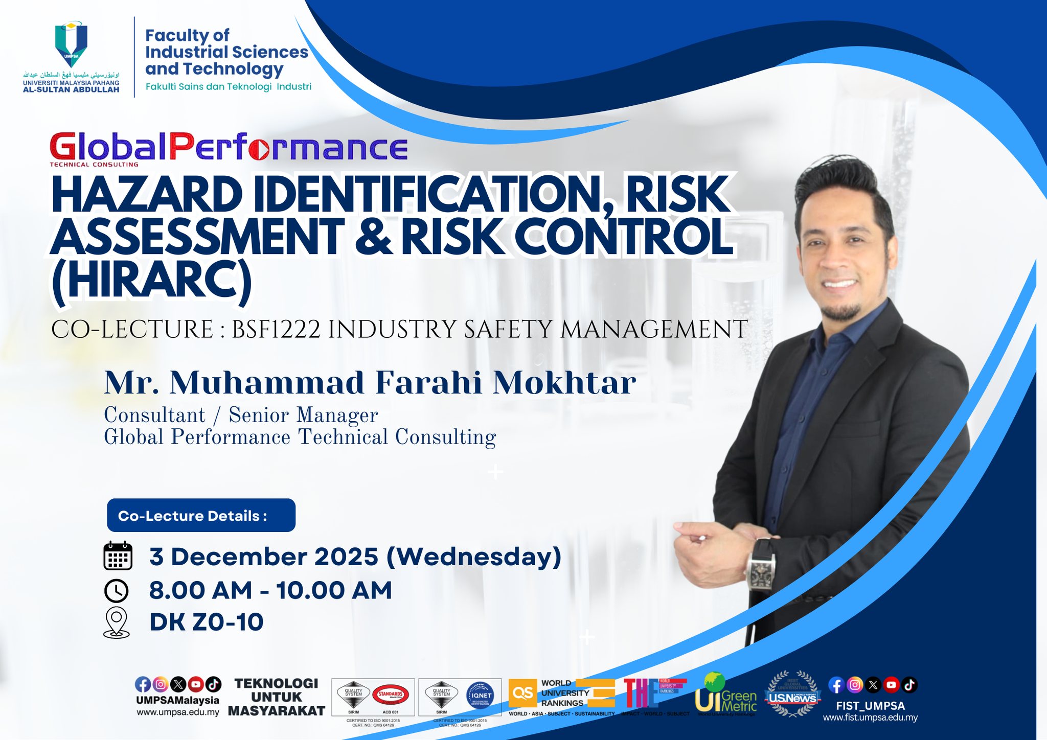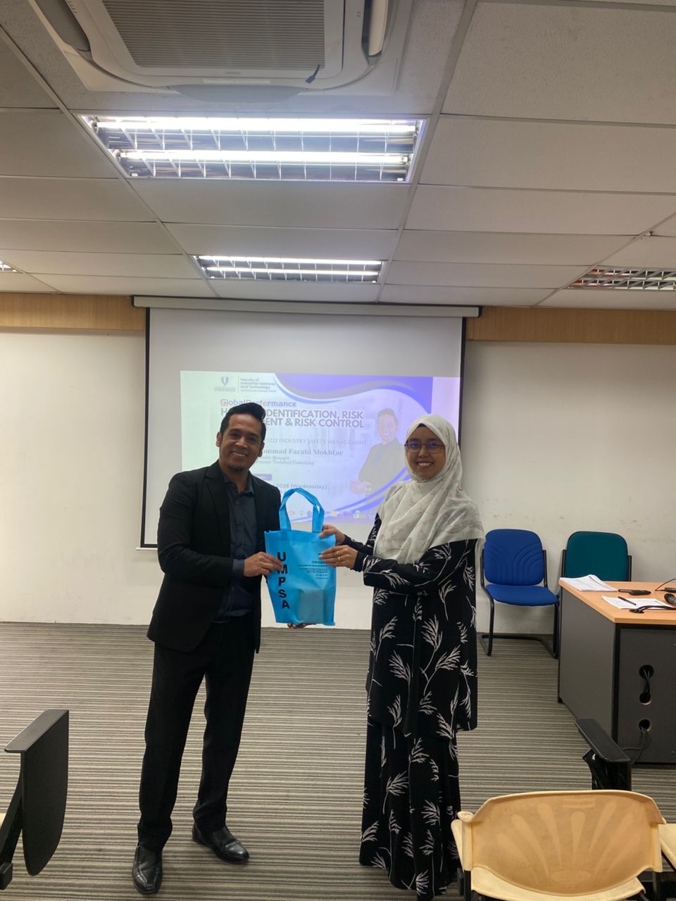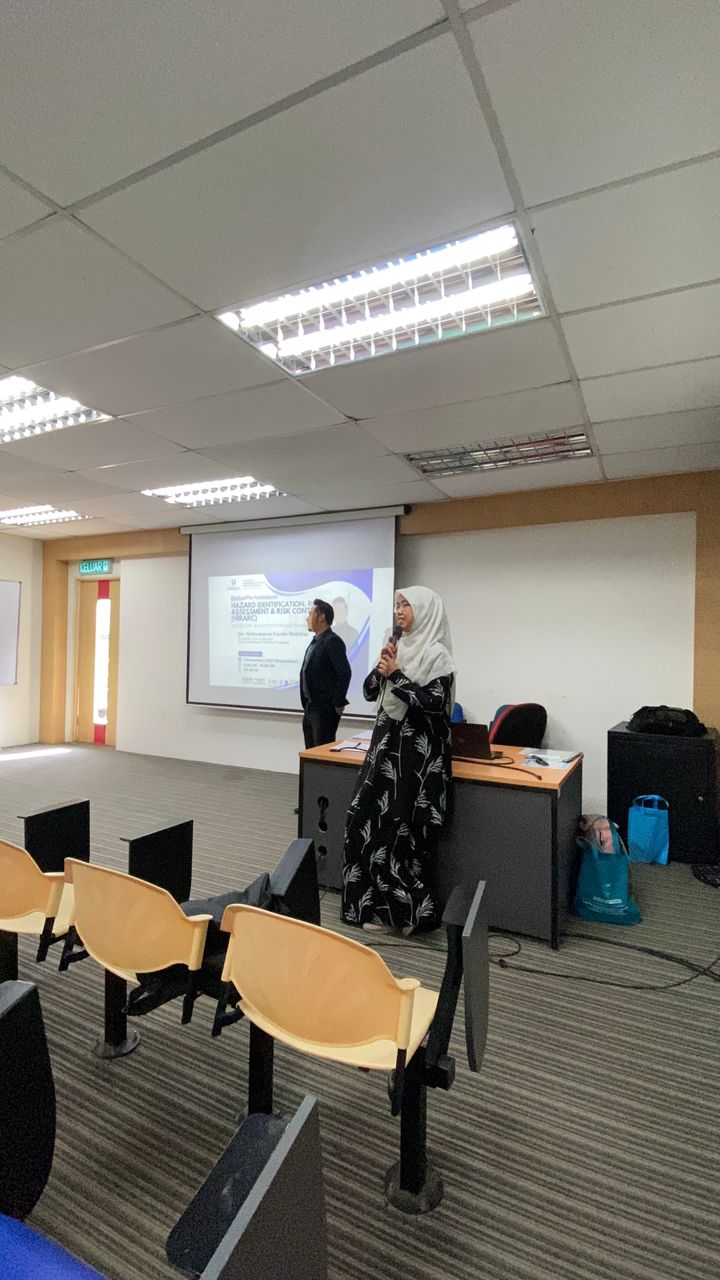 Pelajar telah didedahkan dengan HIRARC dan diberikan penilaian berdasarkan case study yang diberikan. Semoga dengan sesi co-lecture yang telah berlangsung pada hari ini dapat memberikan manfaat dan impak serta pendedahan kepada pelajar mengenai teori kursus dan kaitan dengan industri di luar. Program telah selesai pada jam 10.00 pagi dan diakhiri dengan penyampaian saguhati serta sesi bergambar bersama pelajar.