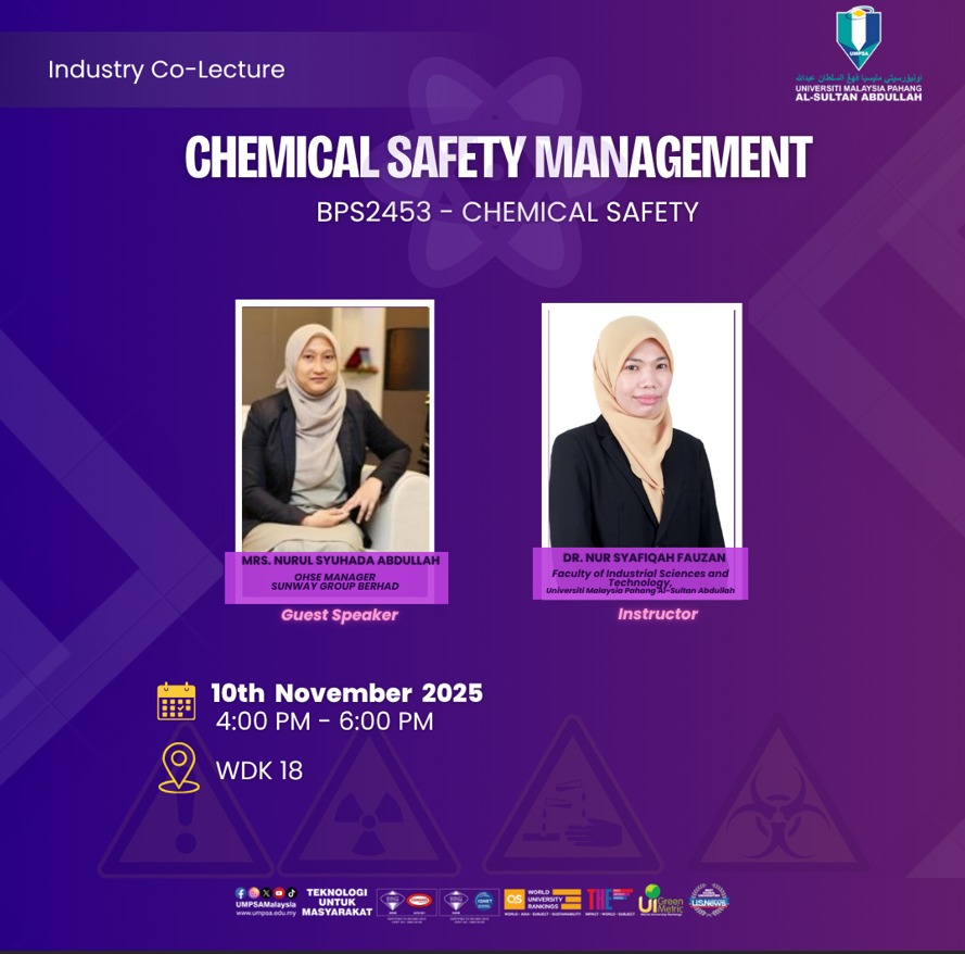 An Industry Co-Lecture was successfully organized by Dr. Nur Syafiqah Binti Fauzan, Course Coordinator from the Occupational Safety and Health Program. The session featured Mrs. Nurul Syuhada Abdullah, Occupational, Health, Safety and Environment (OSHE) Manager from Sunway Group Berhad, as the Guest Speaker.