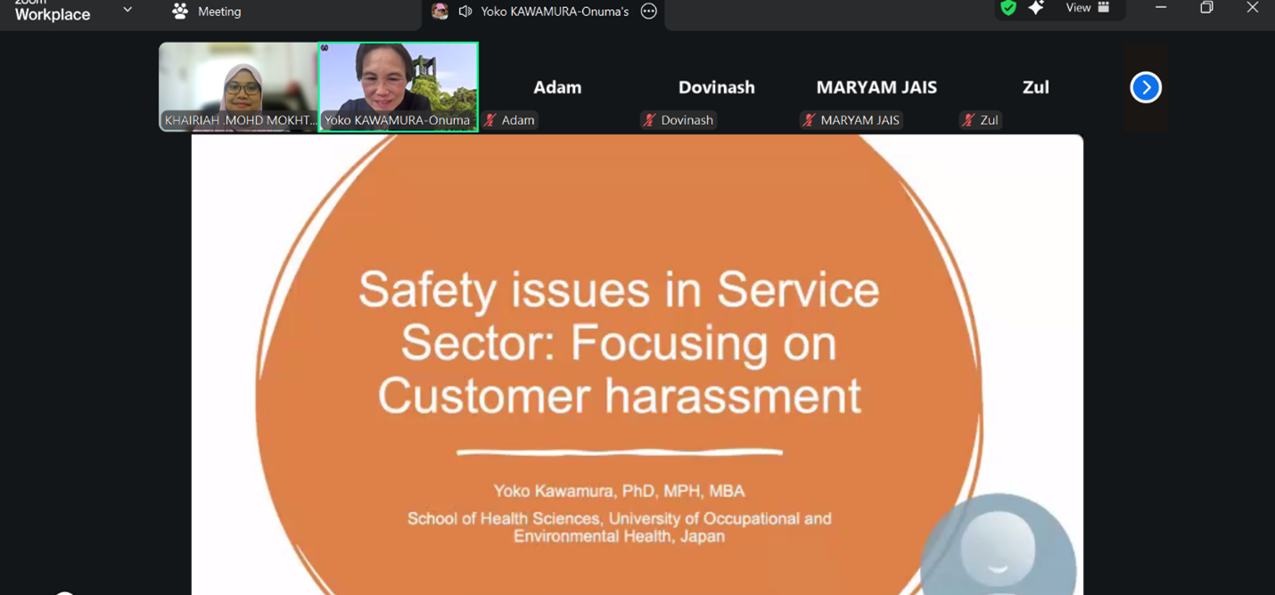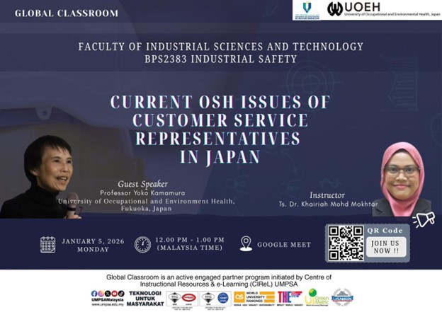 A Global Classroom session for the BPS2383 Industrial Safety course was successfully conducted on 5 January 2026. The session featured Professor Yoko Kawamura from the University of Occupational and Environmental Health, who delivered an insightful lecture entitled “Current OSH Issues of Customer Service Representatives in Japan.”