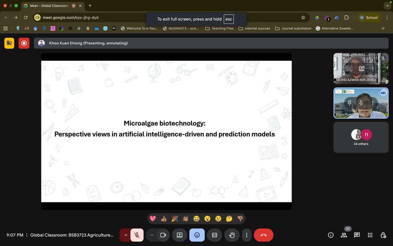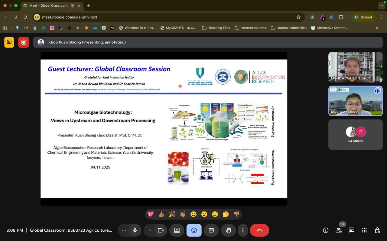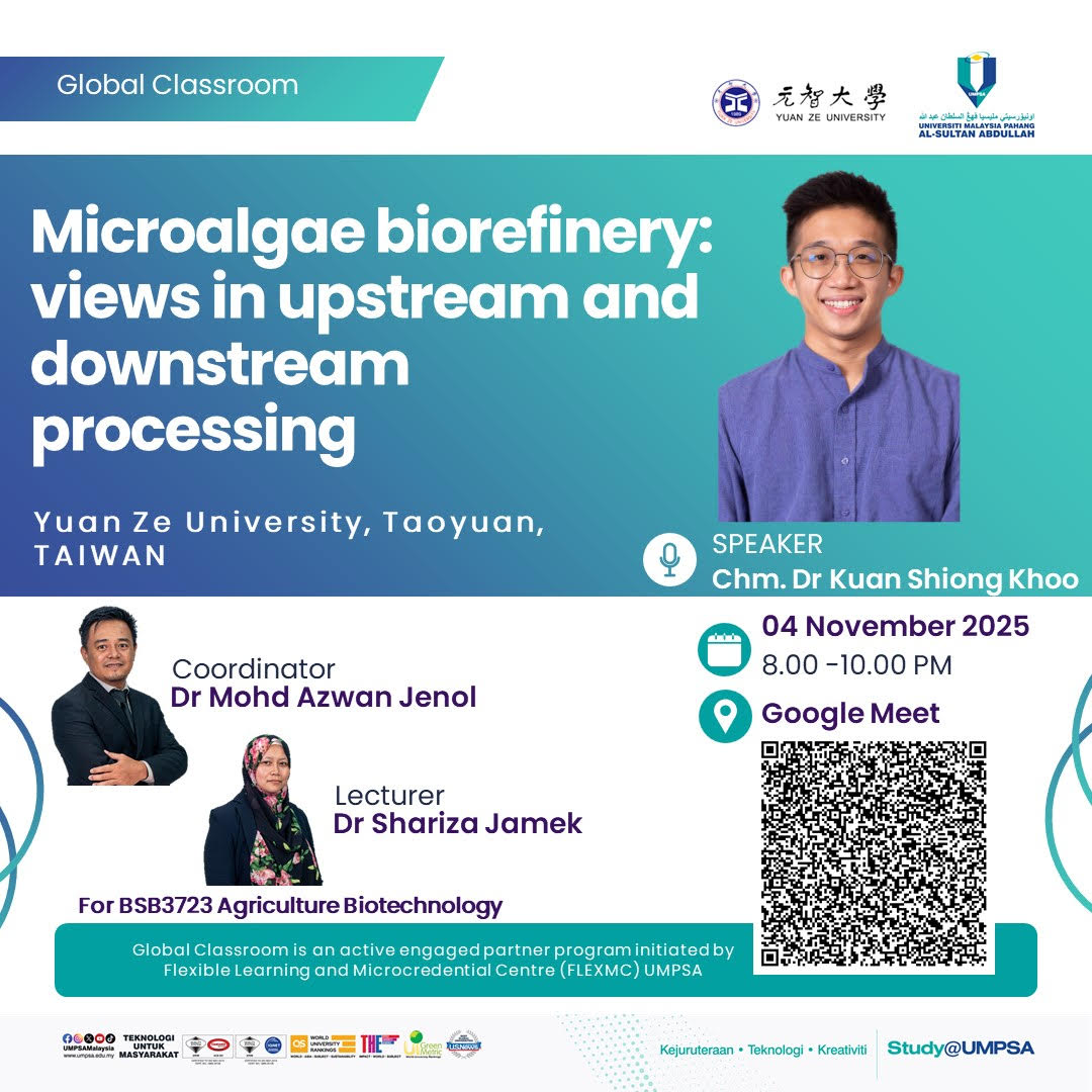 4 November 2025 – A Global Classroom session titled “Microalgae biorefinery: views in upstream and downstream processing” was held via Google Meet. The invited speaker was Chm. Dr. Kuan Shiong Khoo from Yuan Ze University, Taiwan. The session was organized under BSB3723 Agriculture Biotechnology, coordinated by Dr. Mohd Azwan Jenol, with support from Dr. Shariza Jamek.