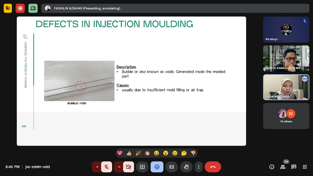 During the session, she introduced her company’s operations and outlined her journey from UMPSA student to practising engineer. She then linked core BSP4172 topics, including material selection, processing routes and process windows, to real injection moulding case studies. Examples showed how polymer grade, tooling design and parameter settings influence product performance, dimensional stability and overall quality.