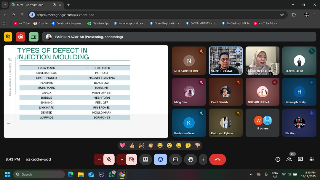 Gambang, 19 November 2025 – Twenty-four BSP4172 students joined an online co-lecturing session on Materials Selection and Processing with an invited industry alumna. The speaker, Ms Nor Fashilin binti Azahar, graduated from the Bachelor of Applied Science Material Technology with Honours programme at Universiti Malaysia Pahang Al-Sultan Abdullah.