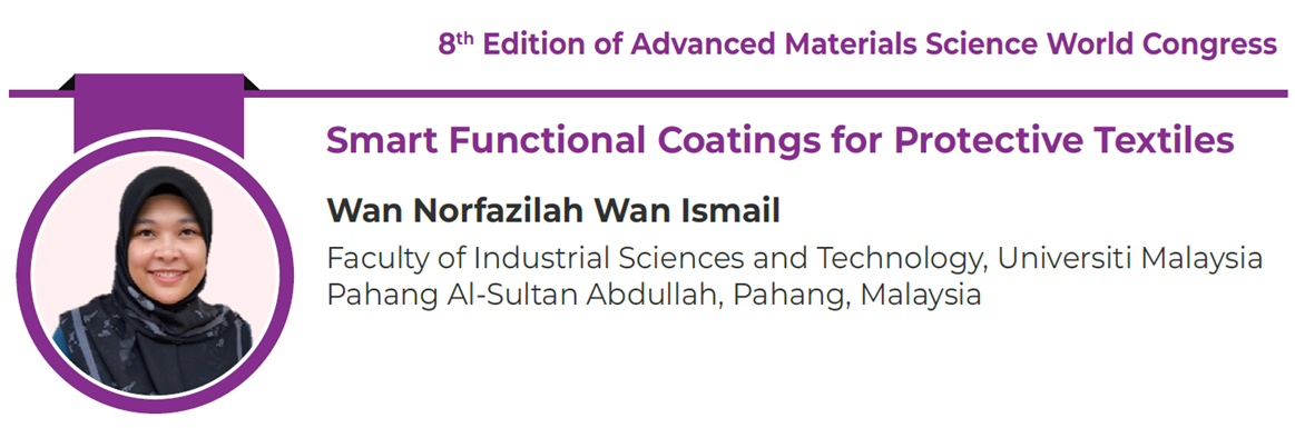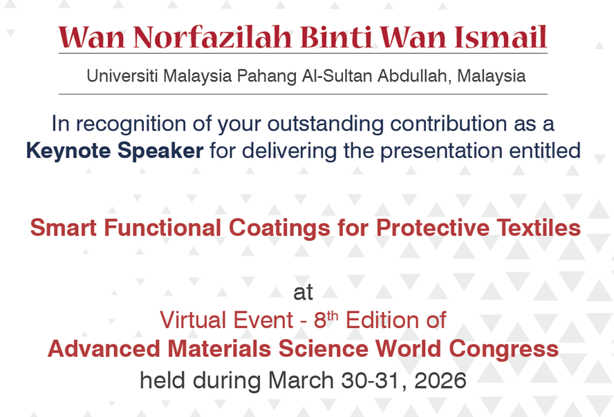 ChM. Dr. Wan Norfazilah Wan Ismail, Senior Lecturer from the Faculty of Industrial Sciences and Technology (FSTI), Universiti Malaysia Pahang Al-Sultan Abdullah (UMPSA), was invited as a keynote speaker at the 8th Edition of Advanced Materials Science World Congress (Adv. Materials Science 2026), held virtually on 30–31 March 2026.