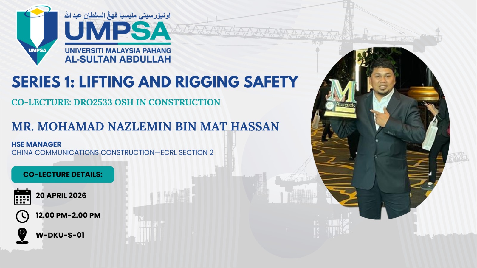 The Faculty of Industrial Sciences and Technology (FIST), Universiti Malaysia Pahang Al-Sultan Abdullah (UMPSA), successfully organized the Industry Co-Lecture Series 1: Lifting and Rigging Safety for the course DRO2533 OSH in Construction on 20 April 2026, held at W–DKU–S–01.