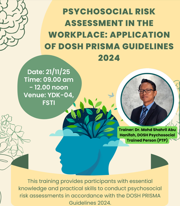 Latihan telah disampaikan oleh Dr. Mohd Shahril Abu Hanifah, seorang DOSH Psychosocial Trained Person (PTP) yang berpengalaman dalam bidang penilaian risiko psikososial. Penganjuran latihan ini bertujuan memberikan pengetahuan dan kemahiran praktikal kepada peserta mengenai pelaksanaan penilaian risiko psikososial di tempat kerja menggunakan Garis Panduan DOSH PRisMA 2024.