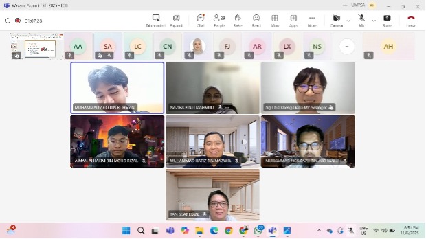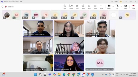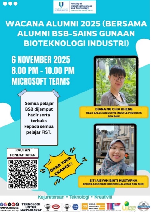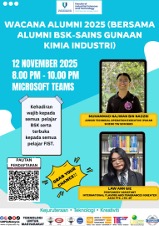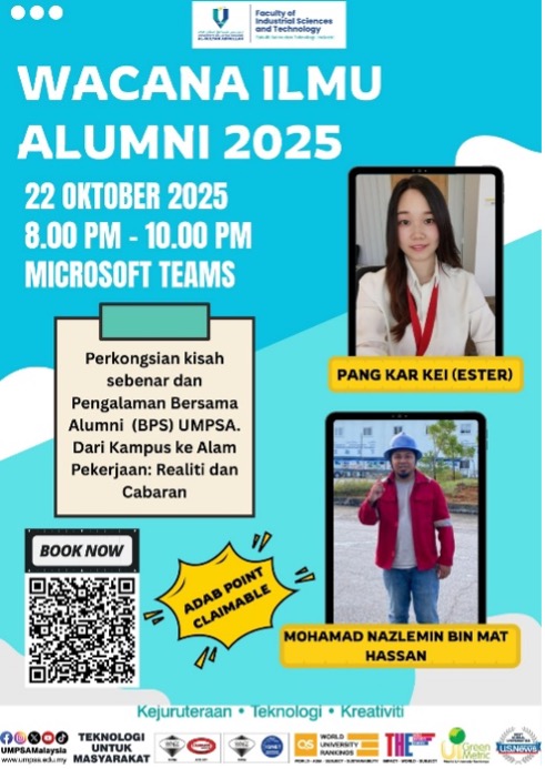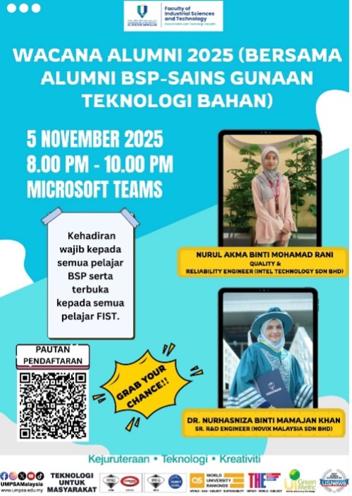 Seramai lapan (8) orang alumni daripada empat program berbeza telah dijemput sebagai panel jemputan bagi berkongsi pengalaman dan perjalanan kerjaya mereka selepas tamat pengajian sehingga ke tahap semasa. Program ini telah dilaksanakan pada 22 Oktober 2025 (BPS), 6 November 2025 (BSK), 12 November 2025 (BSP) dan 13 November 2025 (BSB), merangkumi sesi wacana berasingan bagi setiap program secara atas talian. Kepelbagaian latar belakang alumni yang merangkumi jawatan sebagai Manager Safety, Health and Environment, Field Sales Executive, Perfumery Assistant, Junior Technical Operation Executive, Quality & Reliability Engineer, Senior R&D Engineer serta Senior Associate – Compliance telah memberikan perspektif yang menyeluruh kepada pelajar FSTI berkaitan peluang kerjaya dan keperluan sebenar industri.